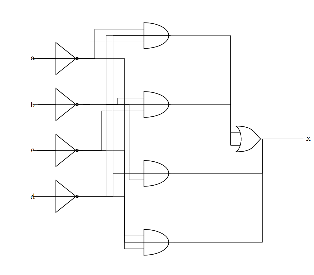 x = (!a&c&d) | (b&!c&d) | (!b&c&d);